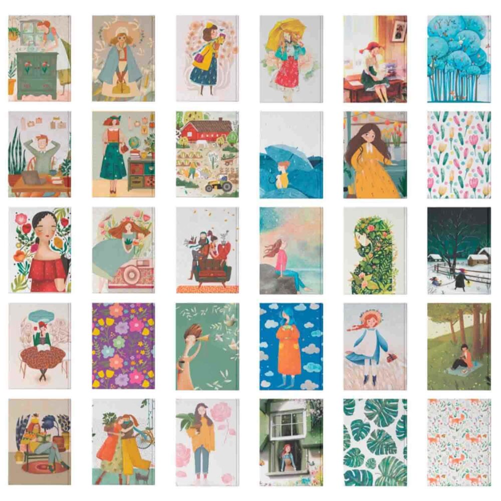 دفتر100برگ20*14جلدطلق پرسی دکمه ای آبرنگ سری تصویرسازی هپی کدA005
